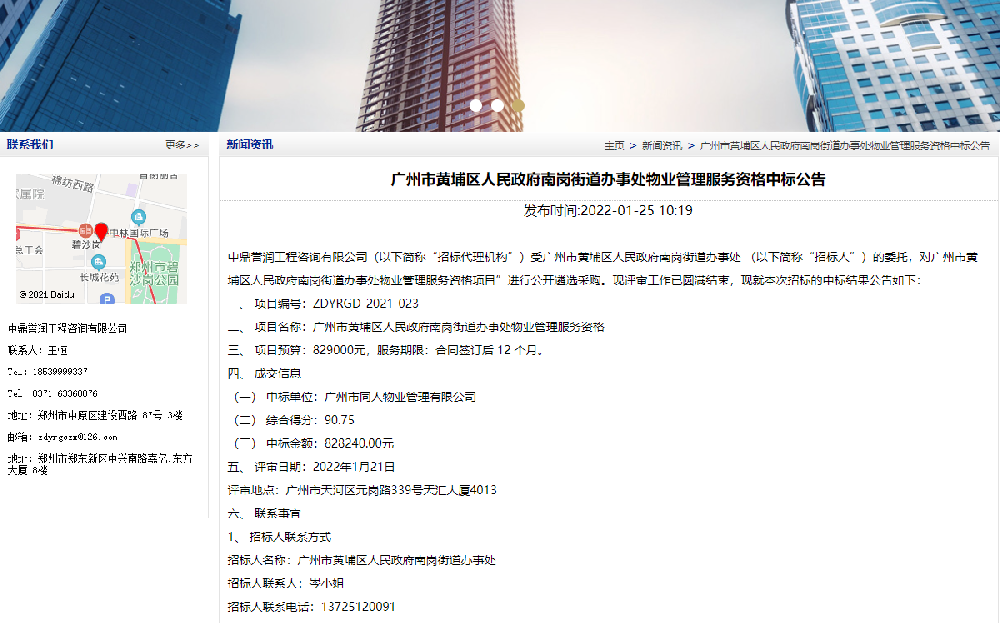 鼎點娛樂工程咨詢有限公司(以下簡稱“招標(biāo)代理機構(gòu)”)受廣州市黃埔區(qū)人民政府南崗街道辦事處 (以下簡稱“招標(biāo)人”)的委托,對廣州市黃埔區(qū)人民政府南崗街道辦事處物業(yè)管理服務(wù)資格項目”進行公開遴選采購。現(xiàn)評審工作已圓滿結(jié)束,現(xiàn)就本次招標(biāo)的中標(biāo)結(jié)果公告如下:一、項目編號:ZDYRGD-2021-023二、項目名[詳細]