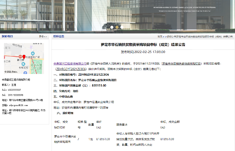 鼎點娛樂工程咨詢有限公司受《羅定市華石鎮(zhèn)人民政府》的委托,于2021年11月19日就(羅定市華石鎮(zhèn)扶貧物資采購項目)采購項目編號:(ZDYRGDYF2021ZC006)詢價進行采購。現(xiàn)就本次采購的中標(biāo)(成交)結(jié)果公告如下:一、采購項目編號:ZDYRGDYF2021ZC006二、采購項目名稱:羅定市華石鎮(zhèn)扶貧物資采購項目三、采購項目預(yù)算金額([詳細]